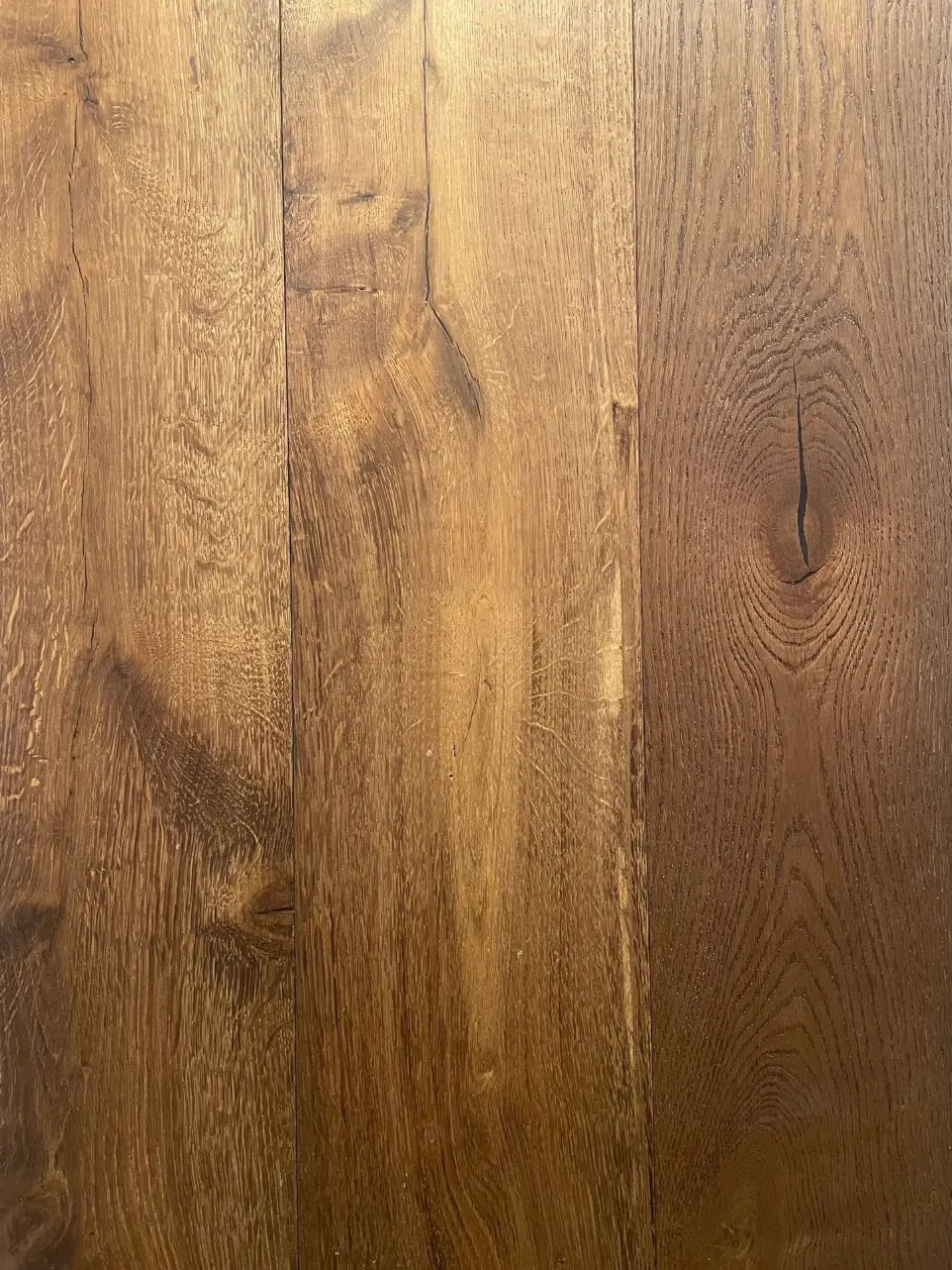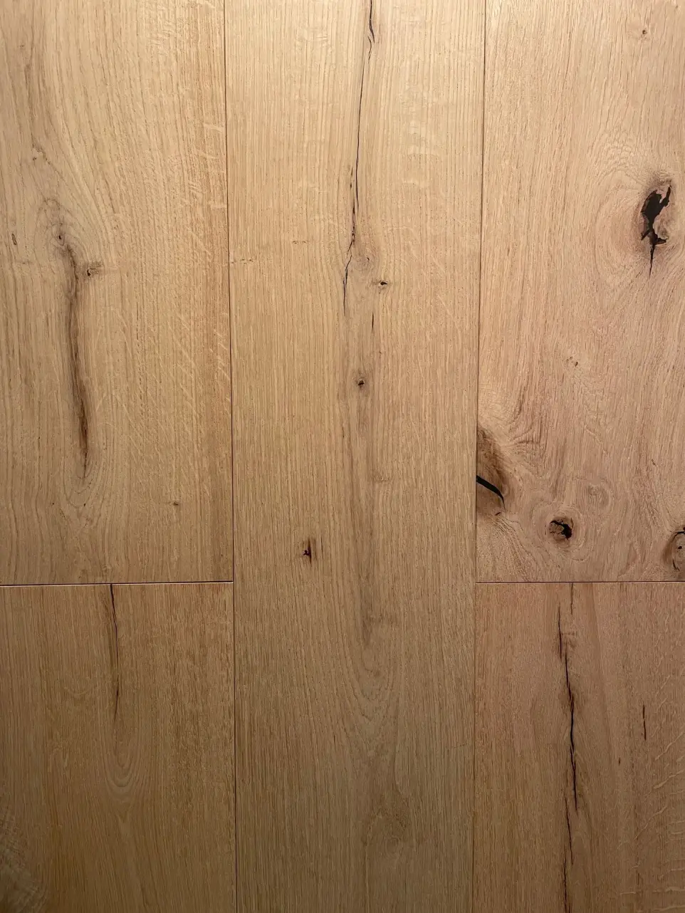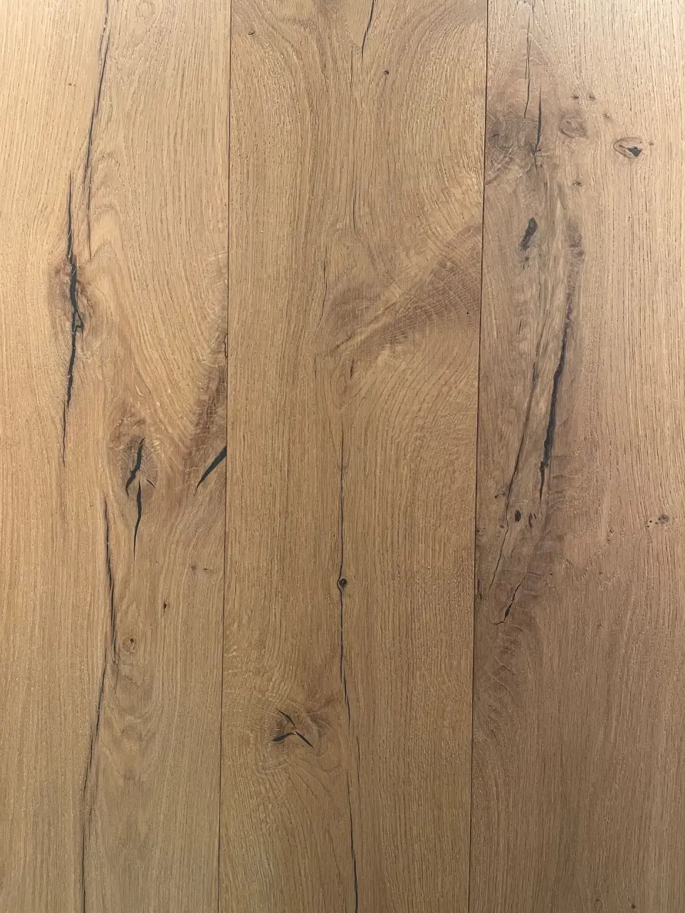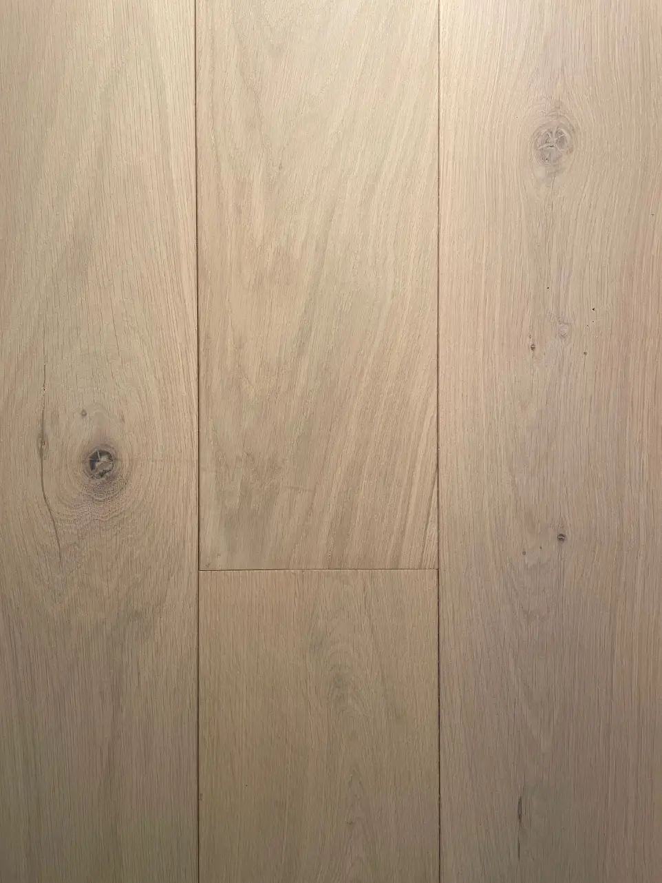 Parquet contrecollé semi massif chêne 15mm dont 4mm de bois noble fini d'usine huilé légèrement blanchi. Choix Rustique B